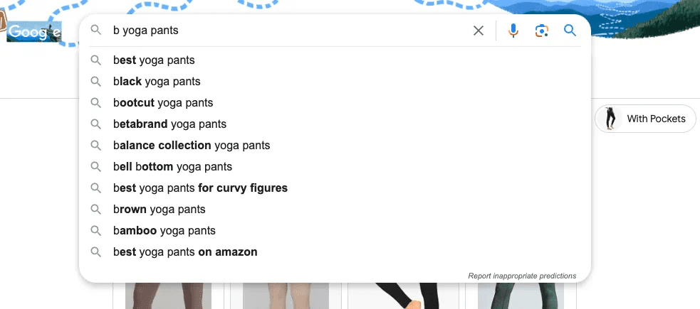 接下来,是第二种方法,可以看作是第一种方法的升级版。它的核心思想是在搜索词的任意位置(无论是前面、后面还是中间),输入任意一个字母或者数字,然后让谷歌为我们提供相应的搜索建议。以“yoga pants”这个关键词为例,我们可以在它的至少 3 个不同位置插入相关的搜索线索。再结合 26 个英文字母与 10 个阿拉伯数字,就能使这个词根衍生出几百个极具针对性的长尾关键词。