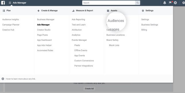 访问广告管理:登录Facebook广告管理平台,点击“受众”选项。