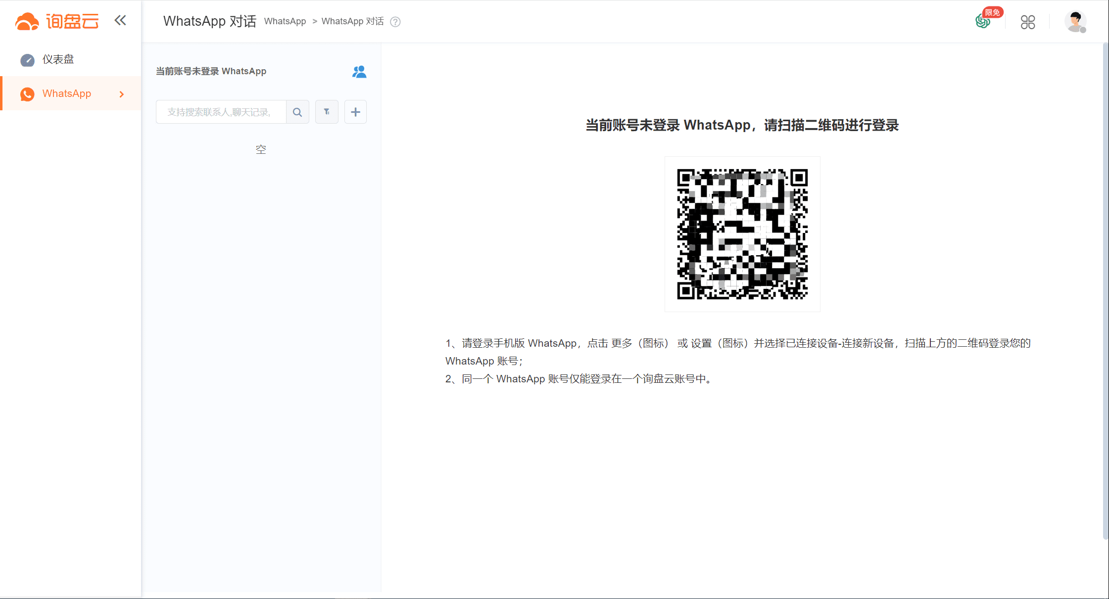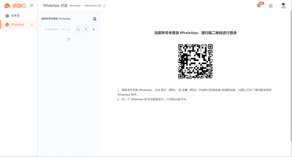 二、登录进来后,打开手机WhatsApp,设置 – 已关联的设备 – 关联新设备 – 扫码,即可登录询盘云WhatsApp。不影响正在网页、iPad或其他地方登录的WhatsApp。