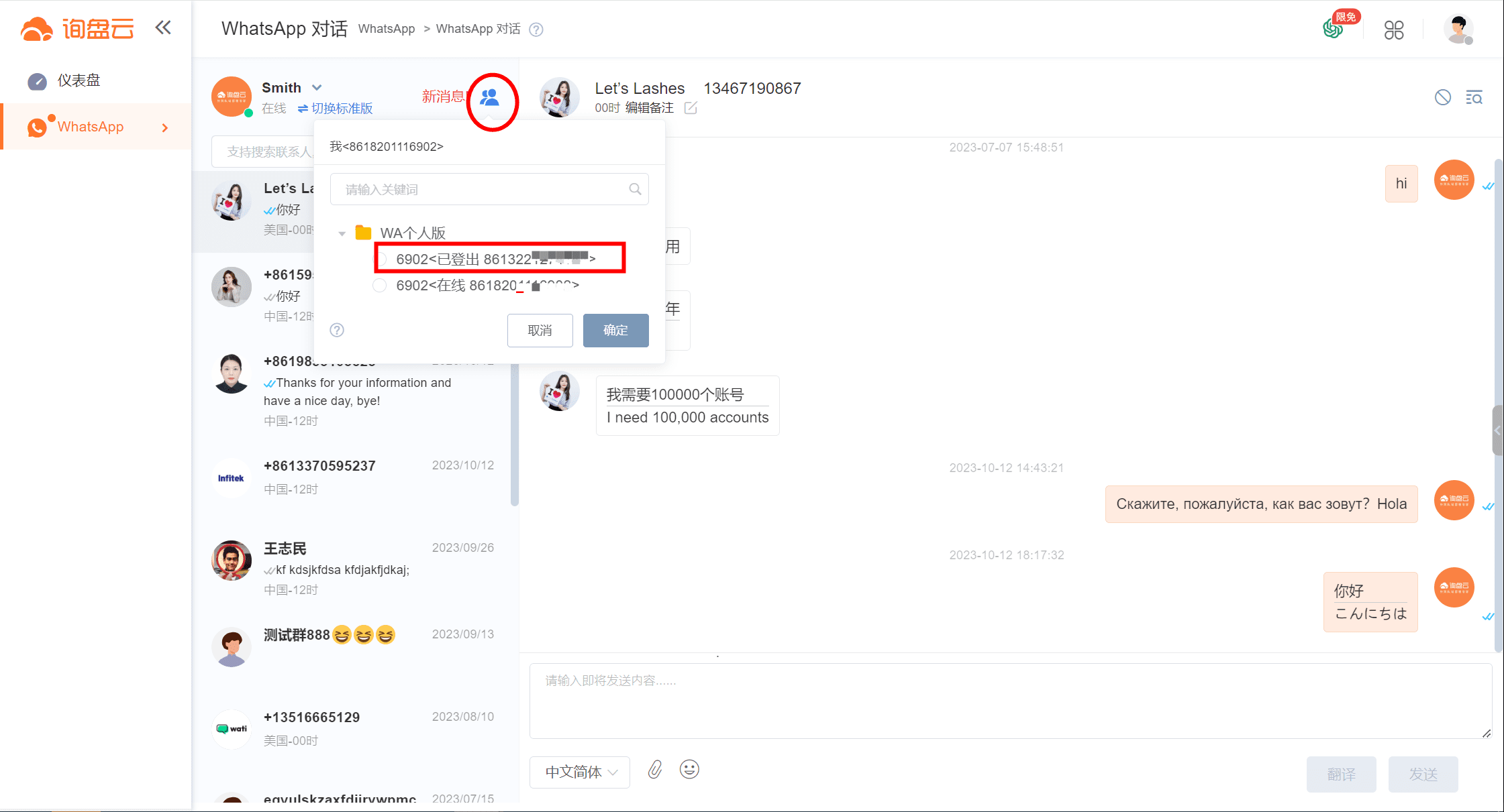 三、可以看到手机上的 WhatsApp 联系人和聊天记录已经同步到询盘云里了。即使 WhatsApp 被封或其他原因无法登录了,也可以通过小人头查看之前登录过的 WhatsApp 的联系人和聊天记录。注意,联系人支持导出,但聊天记录不支持导出,也无法恢复到手机 WhatsApp 上。
