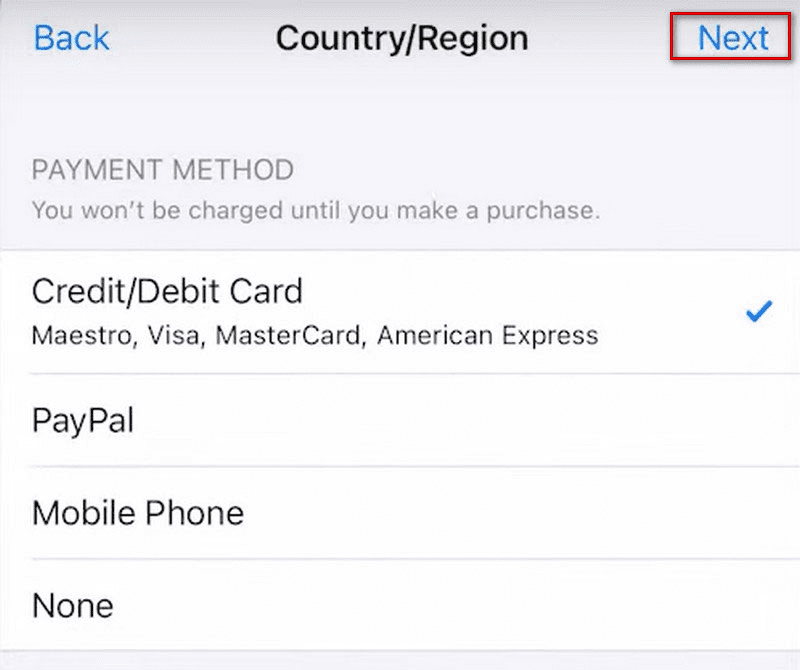 步骤6:选择您的首选付款方式并输入您的新付款信息和账单地址。 轻敲 下一页.