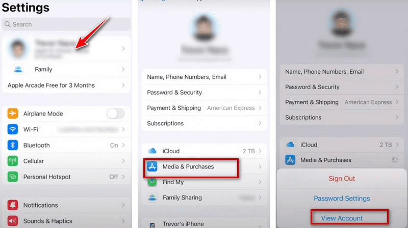 步骤1:点击 个人设置 图标,然后点击您的帐户名称。 然后选择 媒体与购买.