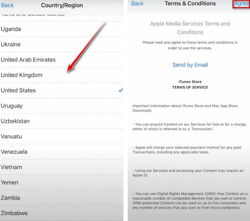 步骤4:选择您的新国家和地区,然后点击它。 然后回顾 条款与细则.