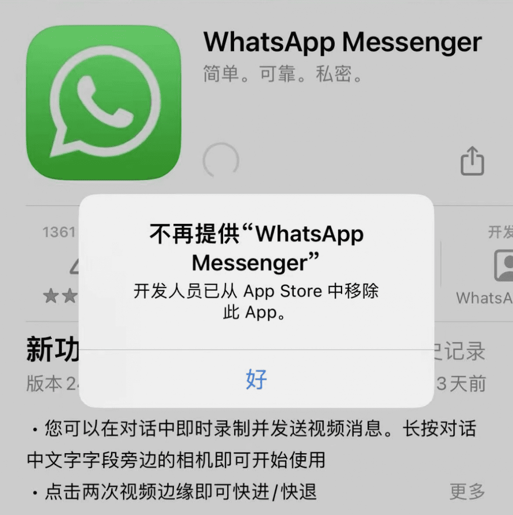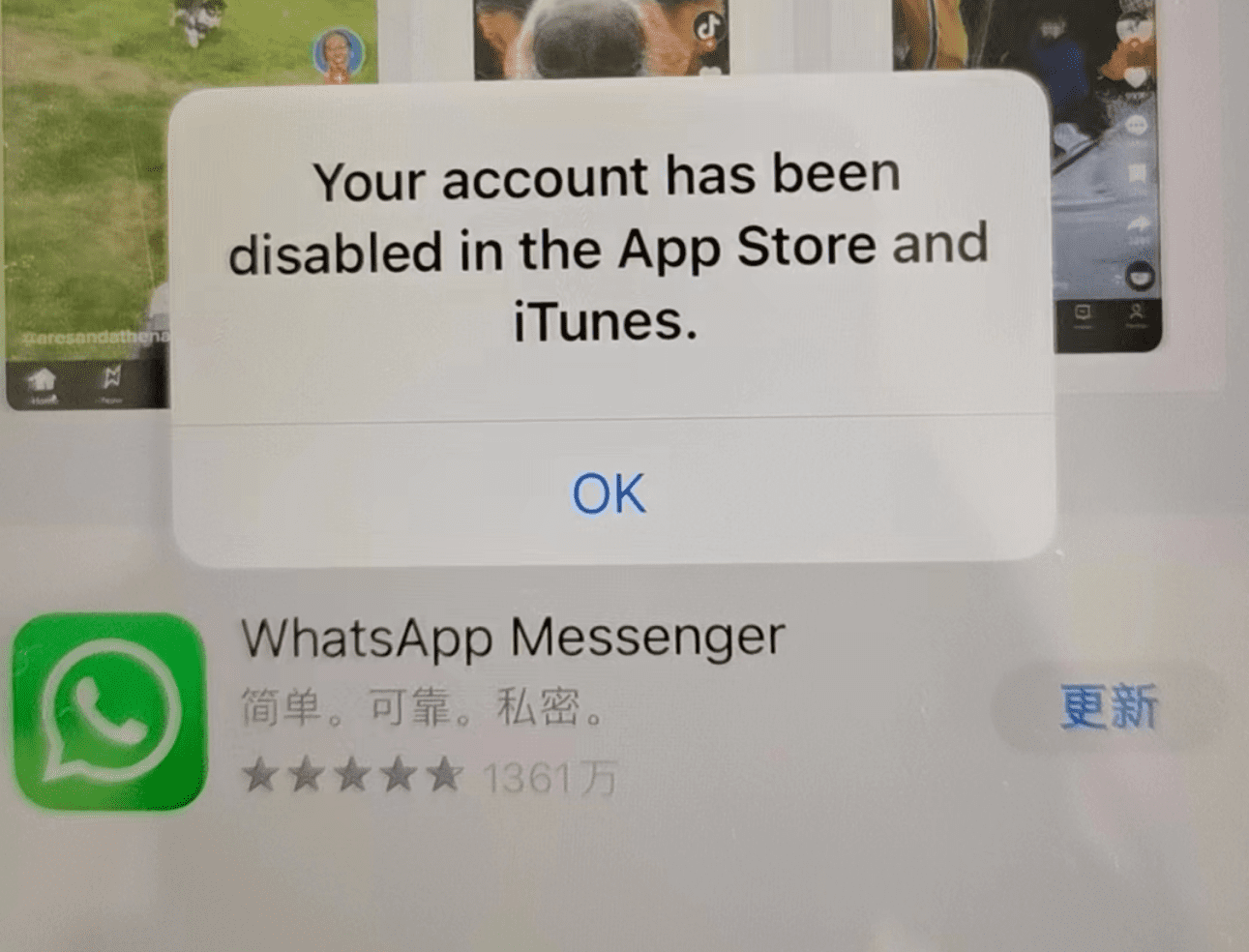 第二个常见的问题是,当你登录新买的外区ID,搜到WhatsApp,要下载的时候,提示你,你的账号已经被停用。