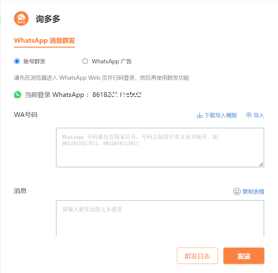 WSMate.com 付费并完成注册后,chrome浏览器下载询多多,可以实现WhatsApp批量自动群发。
