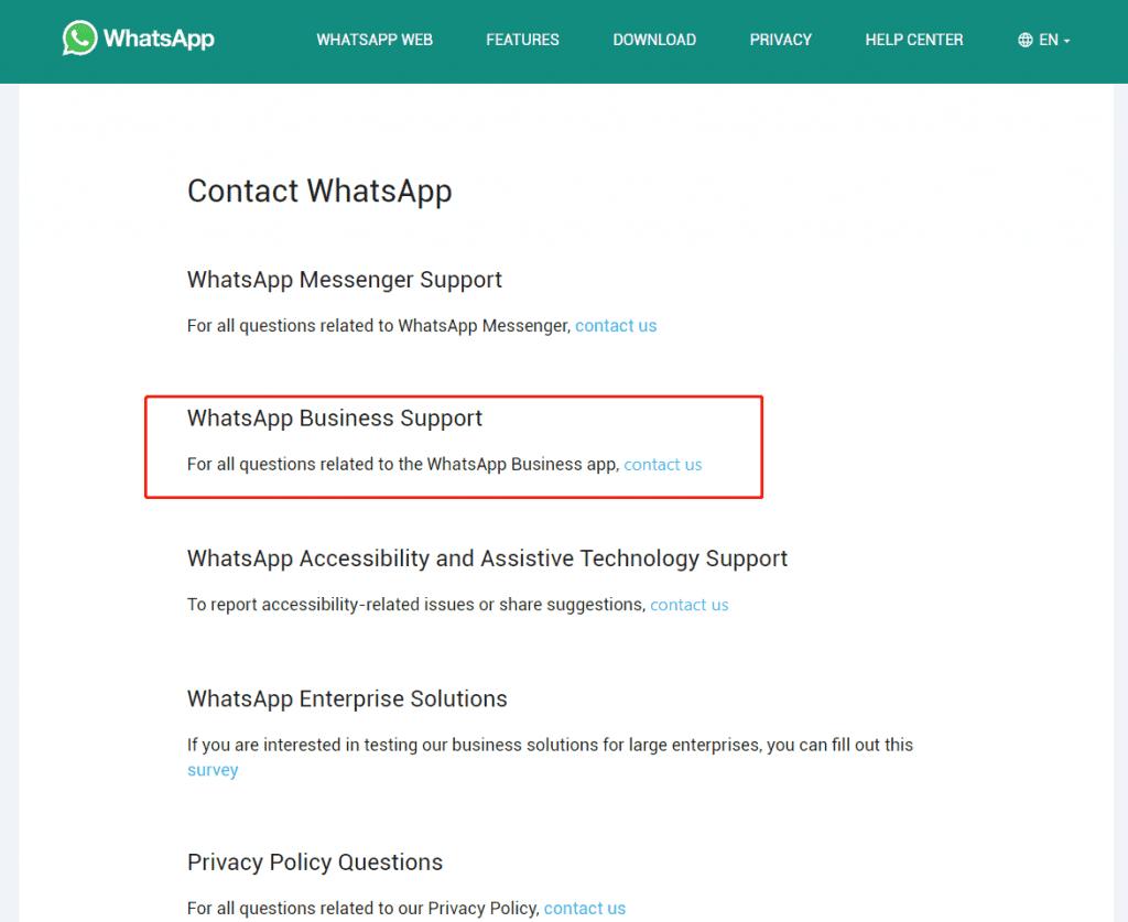 - 在线提交表格:进入WhatsApp官网,选择Contact Us,会出现几个类别。如果是 WhatsApp Business 帐户,请选择第二个选项。