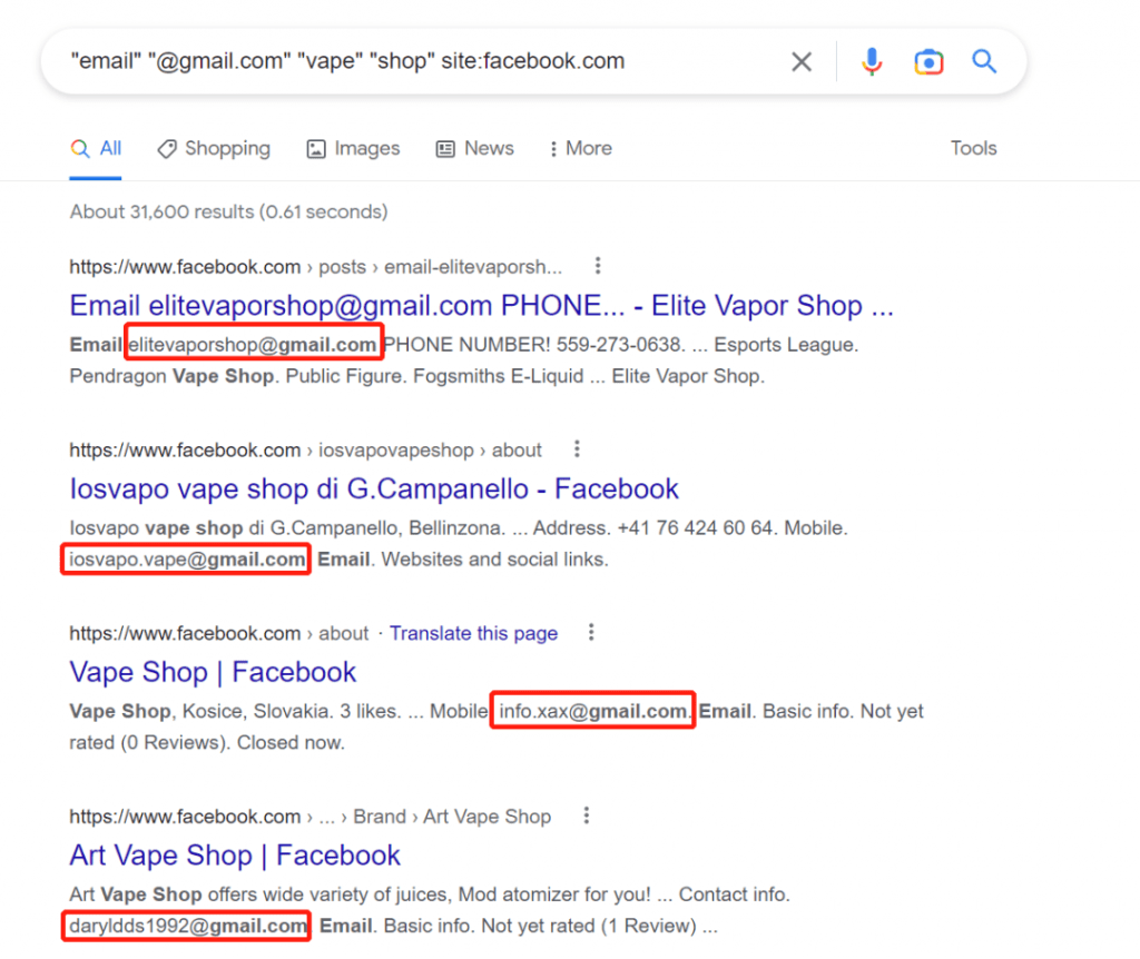 大概意思是从Facebook上找电子烟商店的Gmail邮箱地址,结果如下图: