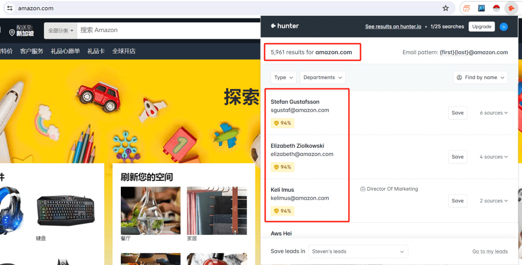 很多网站经过AI过滤,是我们的目标客户,但是网站上的邮箱和WhatsApp都是客服的联系方式,比如info邮箱,而非我们需要的KP的联系方式。这时候就需要根据网站域名来查找一下该公司其他人的联系方式。推荐一个非常好用的工具,叫 hunter.io,注册免费送25个查询名额,而且有Chrome浏览器插件,非常方便。