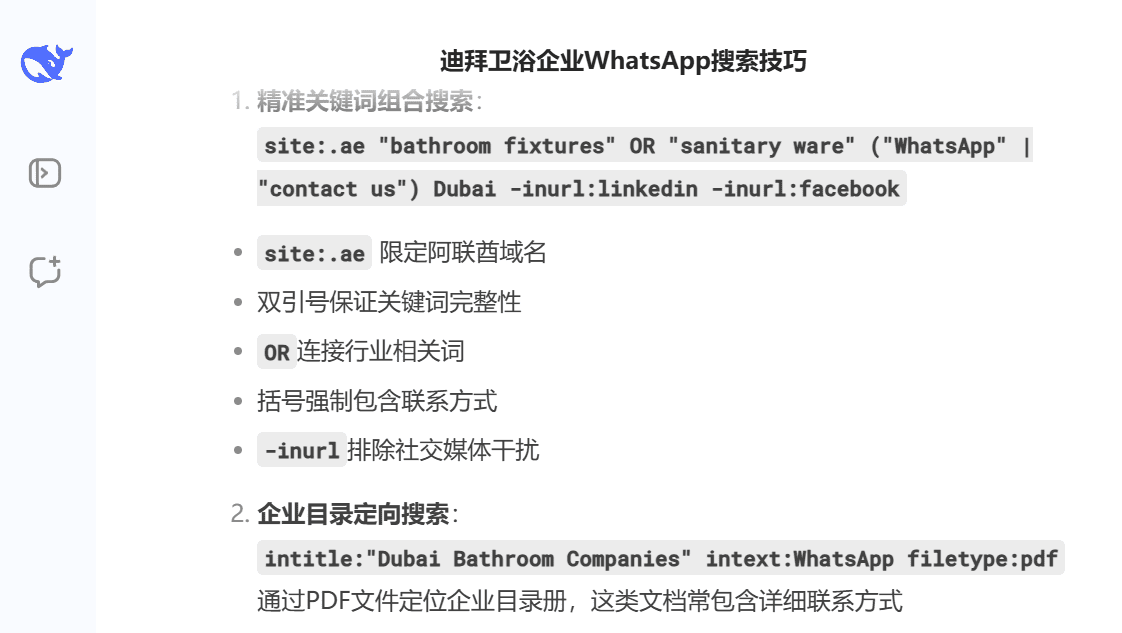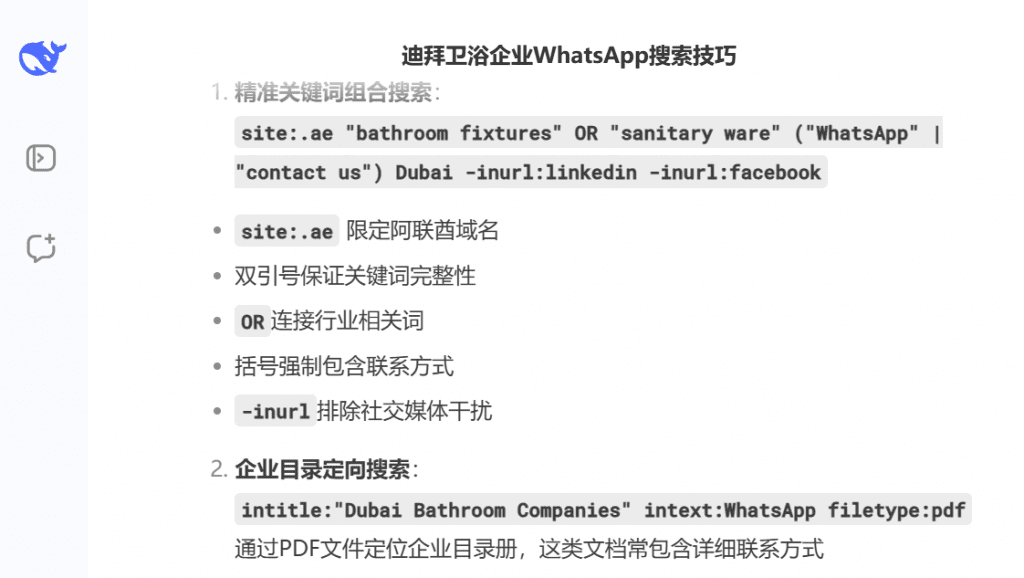 如果你觉得自己写这些谷歌搜索质量比较难,也可以直接向DeepSeek提问,让它帮你写一个完整的谷歌搜索指令,比如“我想通过谷歌搜索找一下迪拜当地的卫浴行业从业企业,且每个网页都带有WhatsApp联系方式”,然后deepseek就可以把搜索指令帮你写出来了。