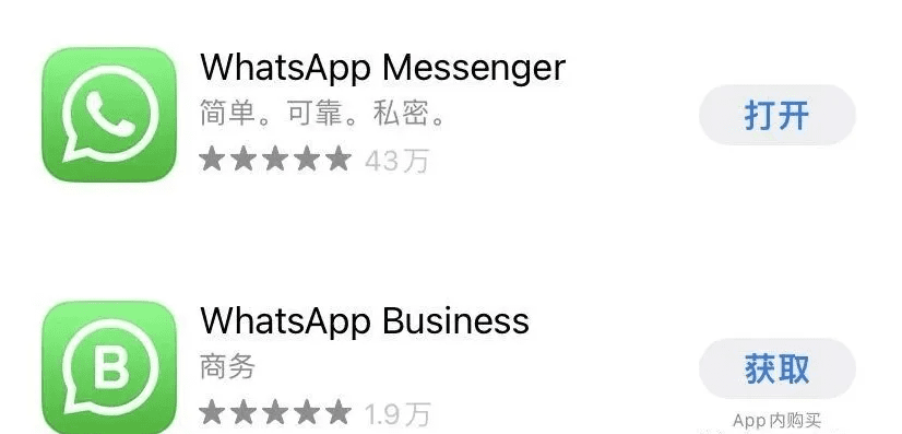 苹果手机直接在苹果商店搜索安装(主要,需要美区ID,没有美区id可以微信找我),我们在Appstore搜索WhatsApp会出现以下2个: