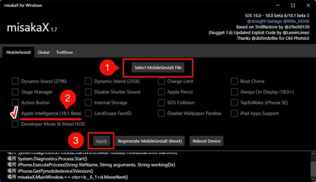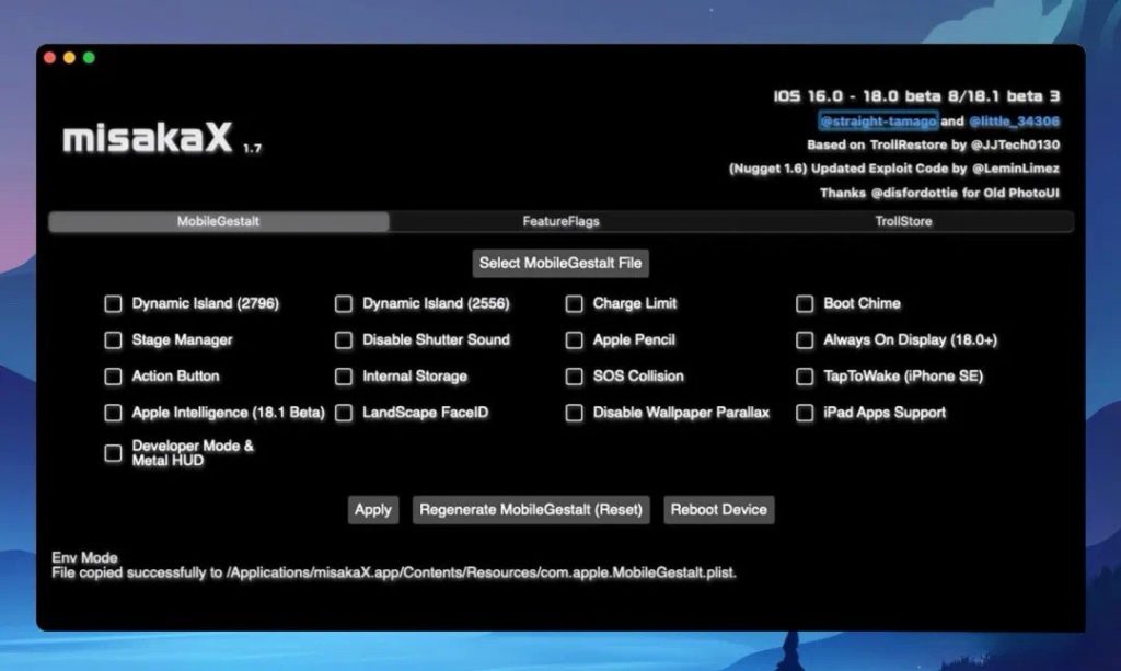 MisakaX 是一款强大的 iOS 系统修改工具,可以帮助我们绕过一些系统限制,包括开启 Apple Intelligence 功能。你可以在github上搜索并下载到 MisakaX 工具的 Mac 或 Windows 版本。