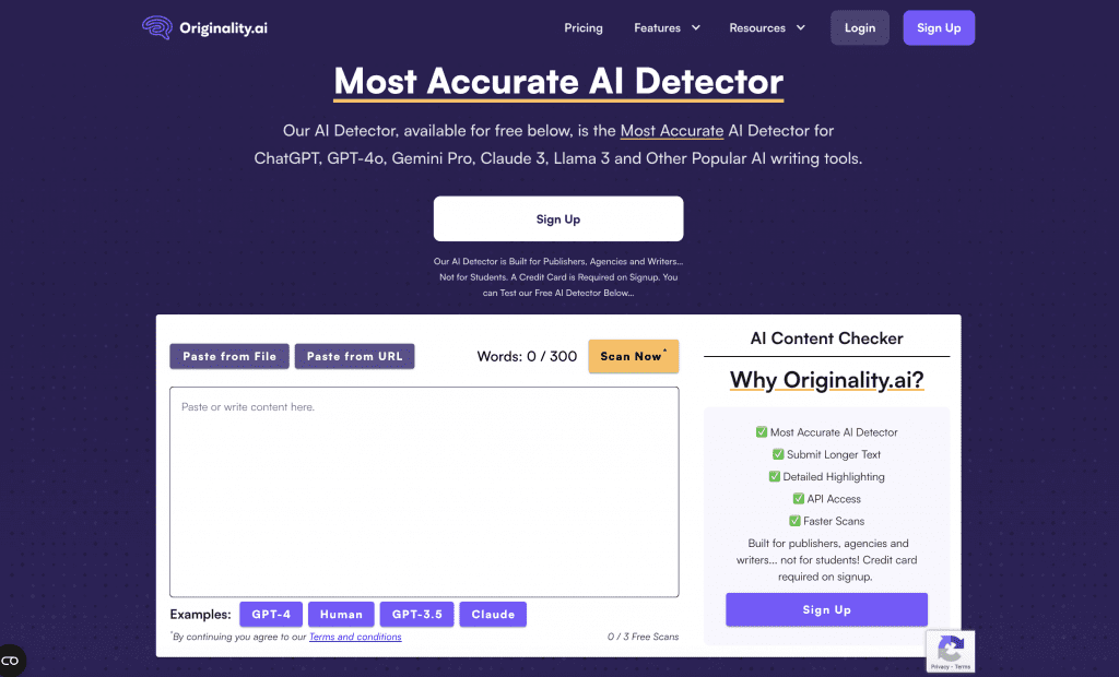 Originality.ai支持检测各种AI模型生成的内容,包括ChatGPT、GPT-4o、Gemini Pro、Claude 3等。它专注于出版商、机构和作者,不涵盖学生群体,这有助于更好地训练模型聚焦于互联网上的已发布内容。