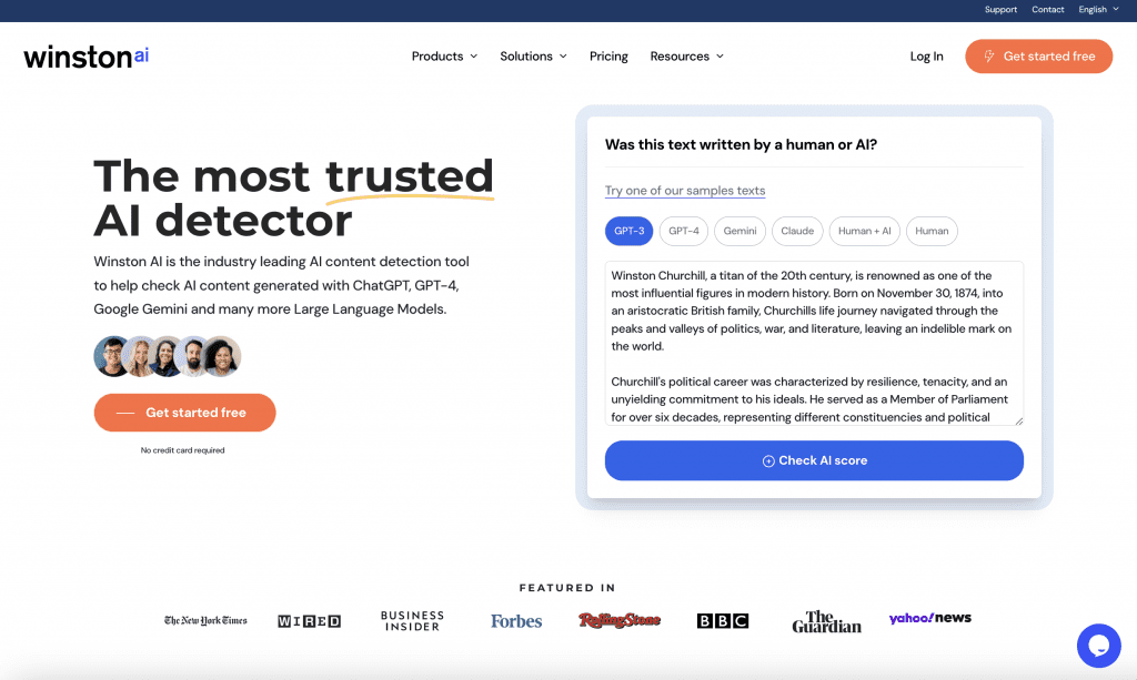 Winston AI号称“最受信任的AI检测工具”,具备99.98%的准确率。它支持文本、多语言检测及高安全性,提供可打印报告和独特的“AI预测地图”。