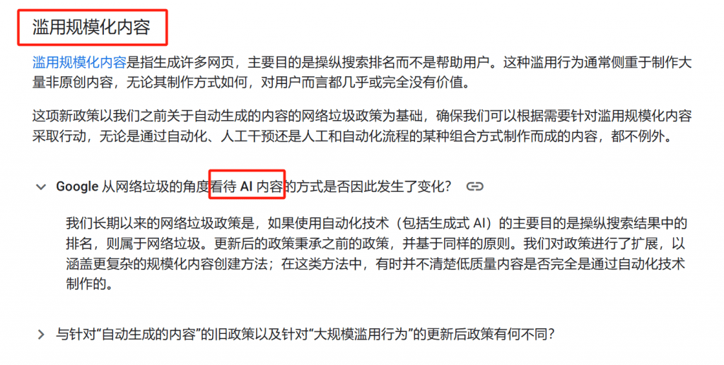 - AI大规模生成的低质量内容,即没有原创性、仅为了增加网页字数而生成的内容,将被视为“内容农场”(Content Farm)的一部分,可能会遭遇排名惩罚。