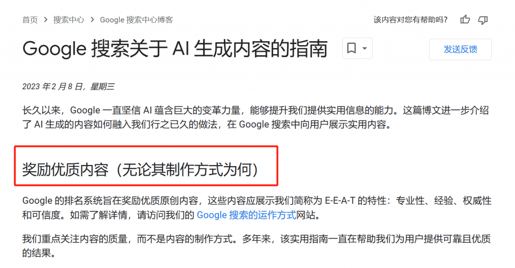 在2023年3月,Google发布的算法更新表明,AI生成的内容与人工生成的内容并没有本质上的区别,关键在于内容是否符合E-E-A-T(Experience, Expertise, Authoritativeness, Trustworthiness——经验、专业性、权威性、可信度)。Google强调的是内容的质量而非创作方式。