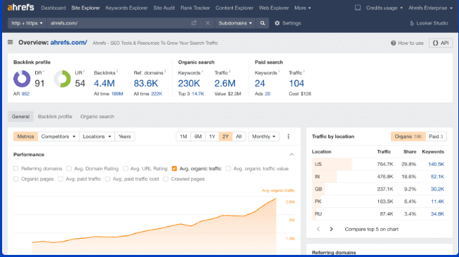 Ahrefs 的 Site Explorer 工具可以帮助你深入分析任何一个网站的流量、排名和反向链接情况。这不仅适用于分析竞争对手,也可以用于审查自己的网站。具体来说,Site Explorer 允许你: