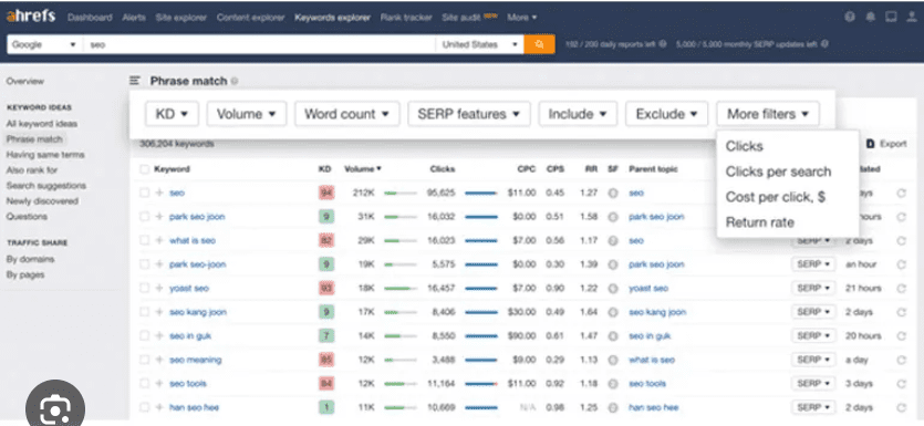 关键词研究是任何 SEO 策略的基础。Ahrefs 提供的 Keywords Explorer 工具可以帮助用户找到与目标关键词相关的长尾关键词、搜索量、竞争程度和潜在流量。通过这个工具,你可以: