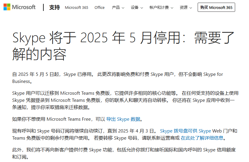 随着微软将重心转移到 Teams,Skype在越来越被边缘化,终于, 2025 年 5 月 5 日起,Skype 官宣停用。