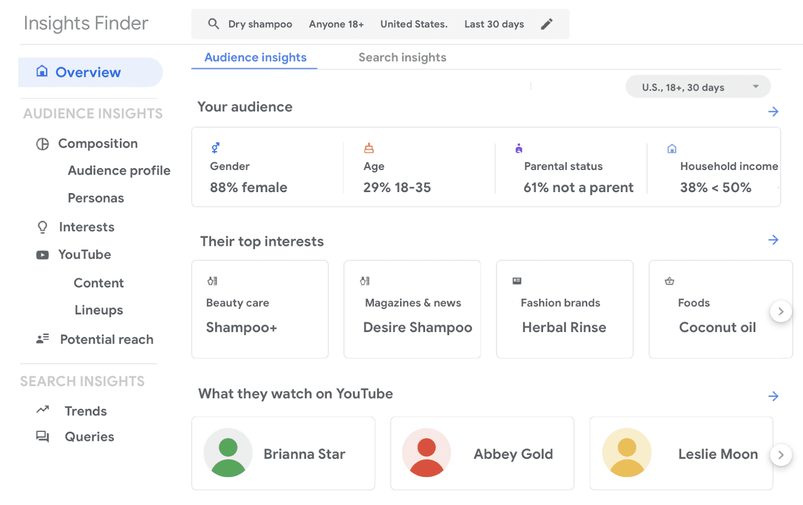 Insights Finder 是 Google Ads 中的一款 Beta 工具,原名“Audience Insights & Market Trends”,用于洞察用户兴趣、搜索趋势及内容偏好,从而帮助广告主制定数据驱动的策略。