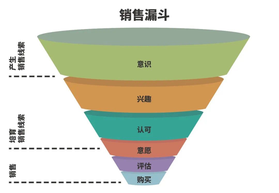 而在数字化的今天,客户拥有更多的自主权,AIDA模型也进行了变革,形成了「Awareness-Interest-Consideration-Intent-Evaluation-Purchase-Share」一个更为复杂的过程。客户在接触产品信息后,并不是简单地受到商业信息的影响,而是会主动去进行调查,以决定是否购买(关于销售漏斗的每个阶段,后文会专门介绍)。