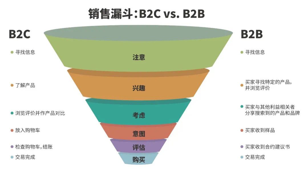 无论是B2C企业、还是B2B企业的客户,都会经历这样一个过程。有所区别的是,大多数B2C客户独自或与朋友和家人共同进行购买决策;而B2B客户的决策者更为庞大,甚至涉及多个部门——有数字表明B2B客户群体的平均人数为5.4人;B2C客户的购买决策过程通常,不会持续很久,而B2B客户不仅会进行大量的前期调研,在Intent阶段,也会通过产品样本等来了解产品的详细情况;B2C客户可能永远不会直接与销售代表发生互动,尤其是在电商网站上;而B2B客户通常会与线下销售代表互动。